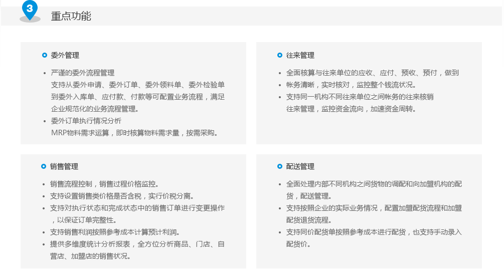 1.数据记录、传递、查询和分析快速而准确,提高运营效率,降低运营成本。 2.规范和优化业务流程,使企业各部门各岗位权责分明,运营有序。 3.实时全面地掌握库存信息,本部库存、分店库存、加盟商库存状况一目了然,并动态监控各地分仓库的物流速度和频度, 大限度地减少库存积压和库损。 4.实时掌握终端销售信息,了解畅销滞销情况,以合理调配采购品种及数量。 5.随时可以与往来客户清晰明了地对帐,了解彼此间的应收、应付以及信用额度情况,降低企业呆帐、坏帐风险。 6.及时、准确、全面的数据分析,为企业决策提供有力的数据支持。 7.让所有与企业相关的分公司、办事处、门店、专柜、分仓库、经销商、加盟商等广泛地参与进来,实现对业务数据的集中管理,提升企业整体监控和决策能力